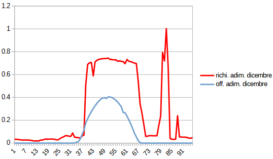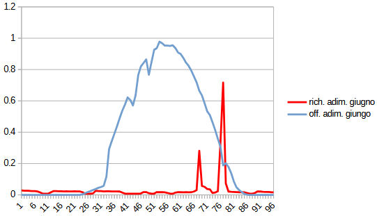Si vedano ad esempio i due grafici tipo (con offerta e richiesta) adimensionalizzati con dominio pari a 24h e con calcolo a intervallo di 15 minuti.