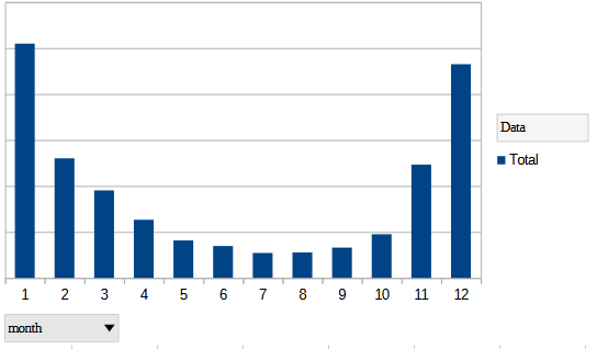 La prima semplice considerazione è che raggruppando i mesi in "mesi invernali: da Novembre a Febbraio", "mesi intermedi: Marzo, Aprile, Settembre, Ottobre" e i rimanenti "mesi estivi: da Maggio ad Agosto" si ottengono le seguenti percentuali: